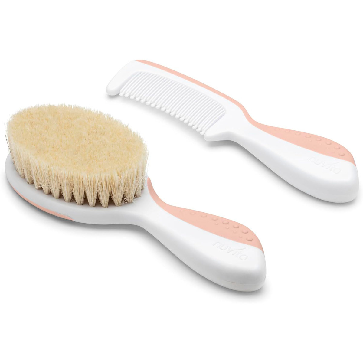 Un kit de cepillo de cerdas naturales para que puedas utilizarlo con un poco de aceite para tratar el pelo del bebé. El peine es redondeado y con forma ergonómica para evitar hacerle daño en la cabeza mientras se peina.