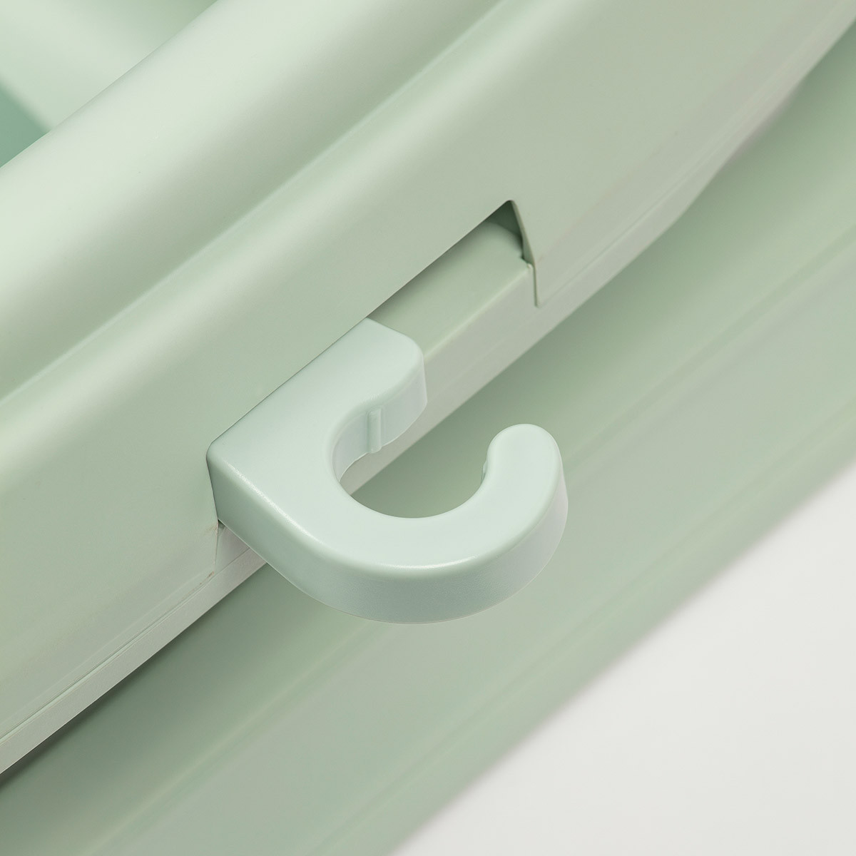 • Gancho retráctil para colgar la bañera despues de usarla y que se seque rápidamente.