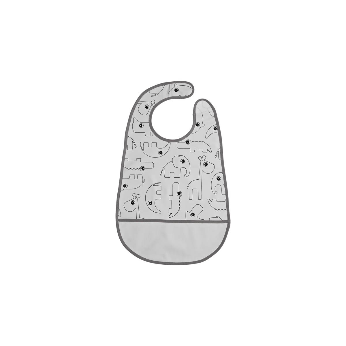Babero con velcro Contour de Done by Deer. Práctico babero con bolsillo en tonos grises con un estampado de divertidos personajes en su parte frontal.