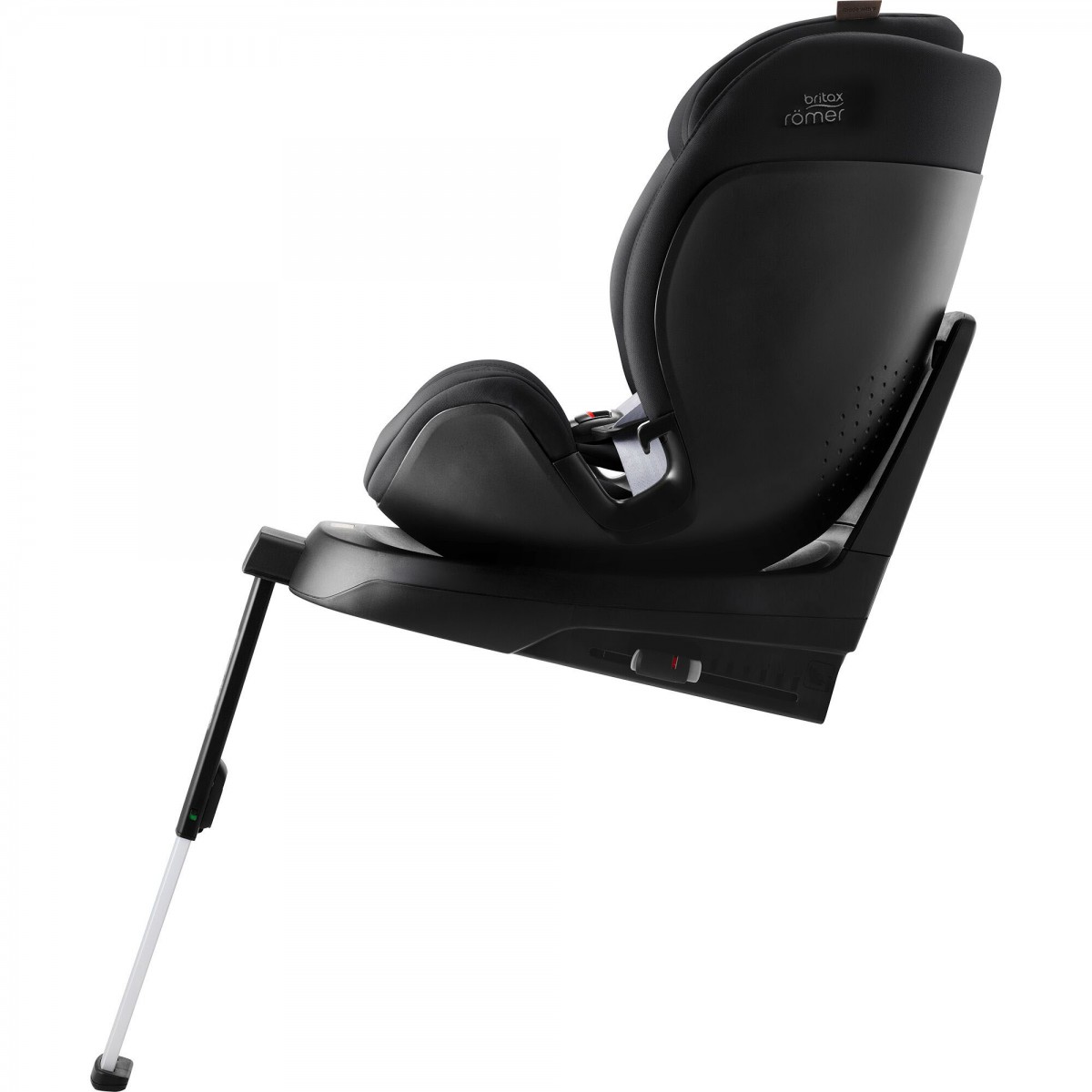 Al alcanzar los 100 cm (máx. 105 cm), el arnés de 5 puntos se guarda plegado en el respaldo. La pata se pliega y permanece en el coche. La silla pasa a funcionar como elevador con respaldo mediante el cinturón de 3 puntos hasta los 125 cm (7 años).