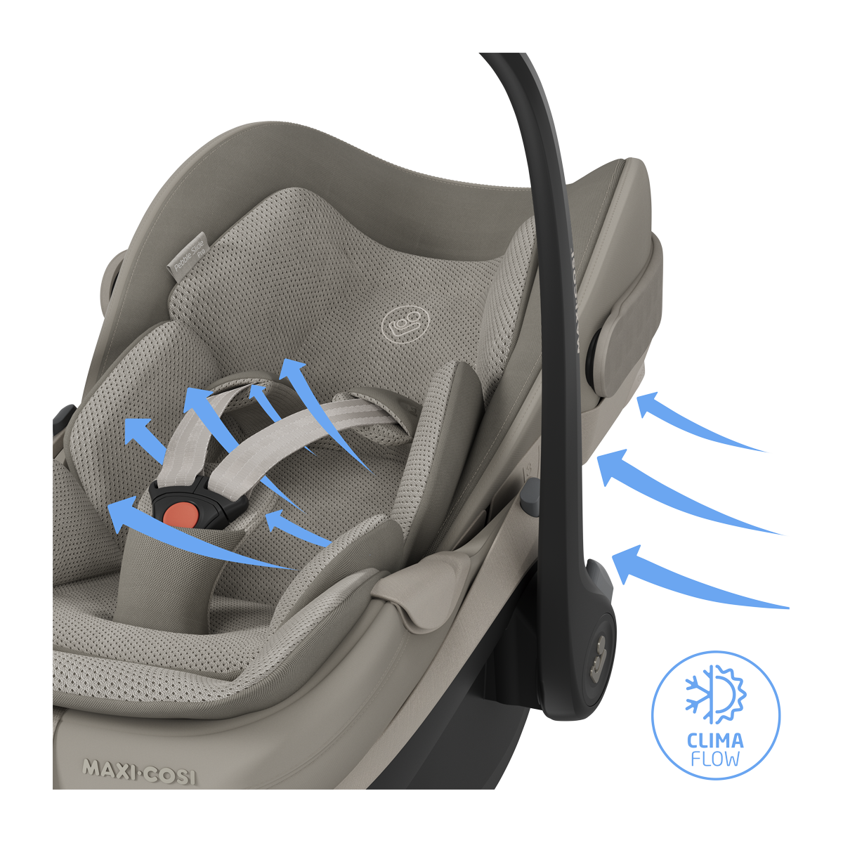 ClimaFlow es el sistema de regulación de temperatura integrado en la silla, que combina paneles de ventilación estratégicamente ubicados, espuma transpirable y tejidos de malla de alto rendimiento para garantizar una circulación de aire óptima alrededor del bebé durante todo el año. En verano evita el sobrecalentamiento; en invierno no interfiere con el abrigo del bebé.
