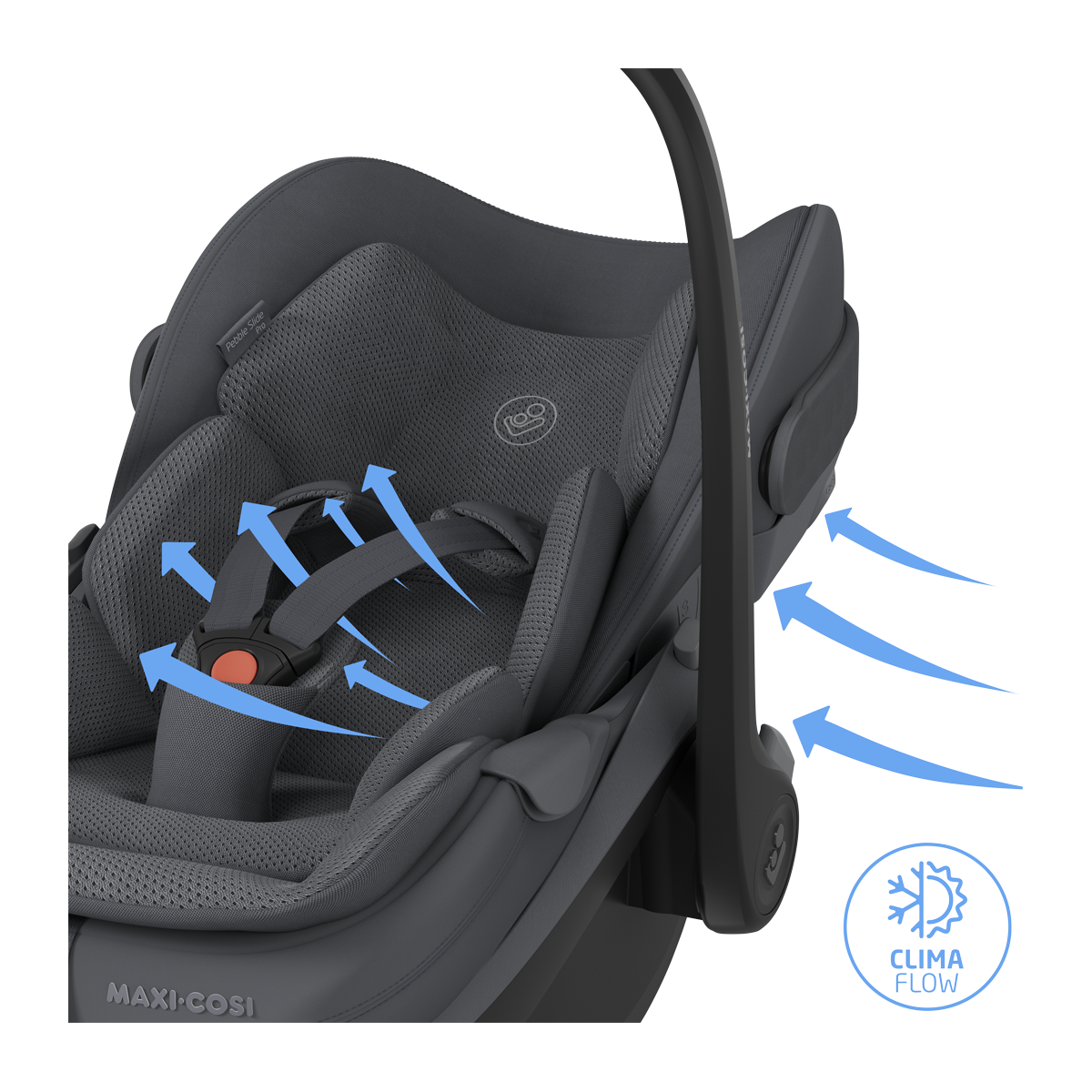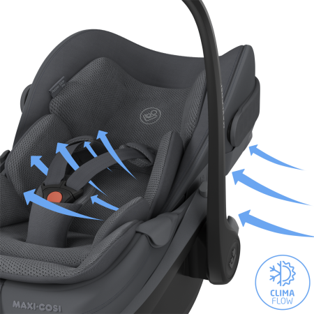 ClimaFlow es el sistema de regulación de temperatura integrado en la silla, que combina paneles de ventilación estratégicamente ubicados, espuma transpirable y tejidos de malla de alto rendimiento para garantizar una circulación de aire óptima alrededor del bebé durante todo el año. En verano evita el sobrecalentamiento; en invierno no interfiere con el abrigo del bebé.