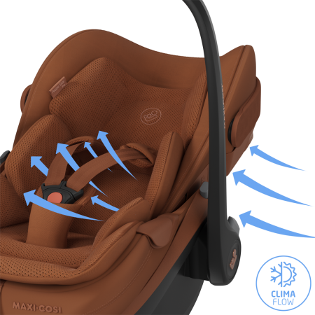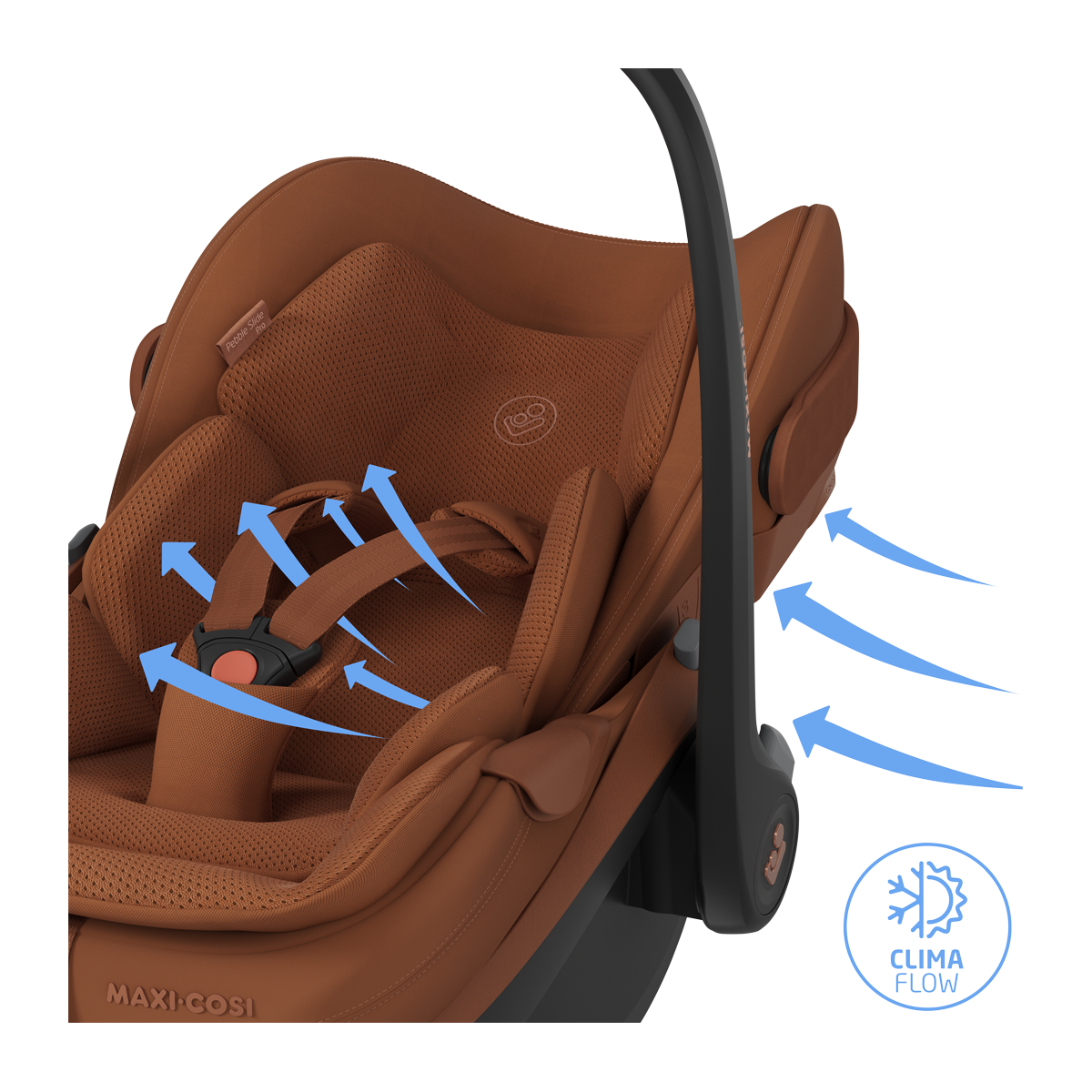 ClimaFlow es el sistema de regulación de temperatura integrado en la silla, que combina paneles de ventilación estratégicamente ubicados, espuma transpirable y tejidos de malla de alto rendimiento para garantizar una circulación de aire óptima alrededor del bebé durante todo el año. En verano evita el sobrecalentamiento; en invierno no interfiere con el abrigo del bebé.