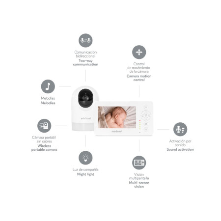 La opción de conectar hasta dos cámaras al mismo monitor y visualizarlas simultáneamente gracias a la función de visión multipantalla. Además, con melodías terapéuticas y luz de compañía para relajar al bebé, el dispositivo incorpora cuatro melodías diseñadas por expertos para los momentos previos al sueño y una suave luz de compañía que brinda seguridad durante la noche.